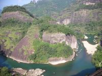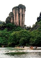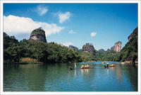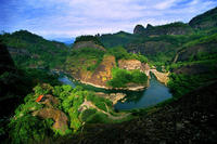 曲折縈回的九曲溪貫穿于丹崖群峰之間,如玉帶串珍珠,將36峰、99巖連為一體。山臨水而立,水繞山而行,峰巖高低、河床寬窄、曲率大小、水流急緩、視域大小、視角仰俯等都達(dá)到絕妙的程度,構(gòu)成“一溪貫群山,兩巖列仙岫”的獨(dú)特美景,溪光山色中溶注了中國傳統(tǒng)的詩情畫意和美學(xué)意境。登山可覽碧水清溪,涉水能看奇峰異石,乘一葉古樸竹筏順溪而下,可賞奇拔秀偉、千姿百態(tài)、爭奇斗妍的形象美;可品泉歌鳥鳴、浪擊輕舟、篙點褐石、綠樹紅花的色彩美;可看流水游魚、浮云飛鳥、艄公游人的動態(tài)美;可睹云繞山嶂、霧鎖峰腰、雨罩群峰的朦朧美,身臨秀色美景,猶如漫步奇幻百出的山水畫廊,聆聽豐富有變奏的交響樂章,欣賞韻味獨(dú)特的瑤池歌舞,品味韻律有致的美麗詩篇,如癡如醉,飄飄欲仙。這是武夷山自然景觀的精華,堪稱世界一絕。