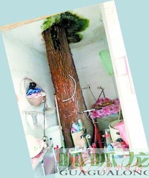 10年前建樓時,宅基地上有棵樹,為保住樹房子環(huán)樹而建,給主要支干預留孔洞,如今這棵樹長成了參天大樹,“破樓”而出。
