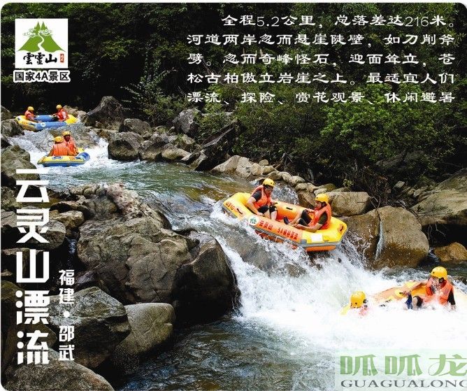 云靈山:“中華第一漂”—云靈山峽谷漂流,全程漂(激險漂+親情漂):全長5.2公里,總落差216米,最大落差30米。漂流時長約1小時40分鐘。